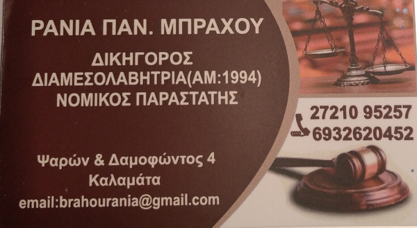 Η δικηγόρος διαμεσολαβήτρια Μπράχου Σταυρούλα αναλαμβάνει αστικό, εμπορικό, κληρονομικό, οικογενειακό, ποινικό, τραπεζικό δίκαιο, υπερχρεωμένα νοικοκυριά, κόκκινα δάνεια).